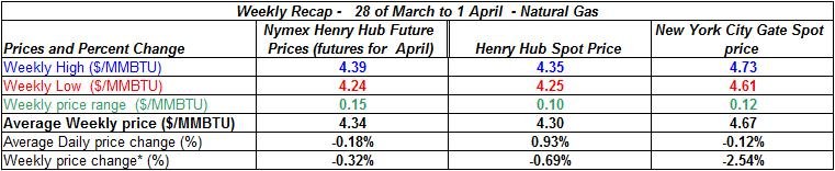The Nymex Henry Hub Future Price (April delivery) also fell by 0.69% during the week, but its average price was 4.3% higher than last week’s average.