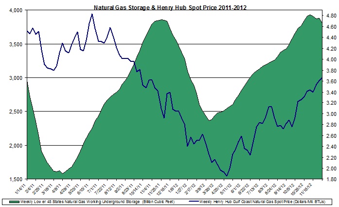 In the chart above are the changes (based on weekly numbers) in storage (and Henry Hub spot price in 2011-2012. As seen, the price of natural gas has risen in recent months while the storage levels remained virtually unchanged.