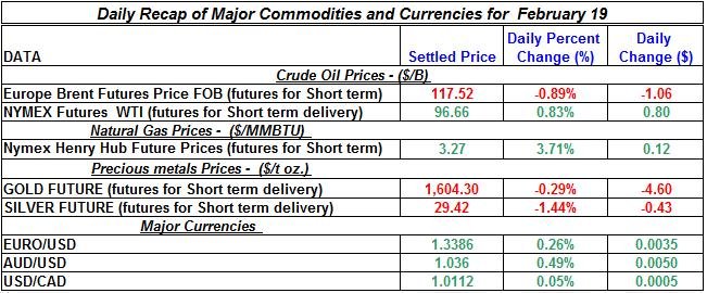 Here is a summary of the daily changes of precious metals and energy commodities for February 19th, 2013: