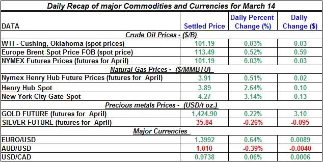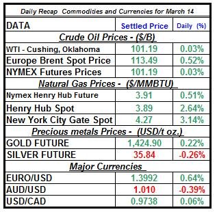 Let’s review the main changes in major energy commodities market and precious metals for March 14th: