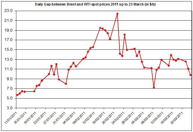 The Brent oil and WTI spread: as of yesterday, March 23rd the difference between Brent and WTI declined to 9.8$/b; I speculate that the spread will continue to range around 10-13$/b as it did in the last month and seen in the graph below.