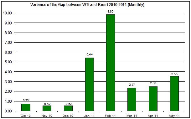 The chart below also shows that the variance in May of the difference between Brent oil and WTI spot oil reached 3.55 – the highest level since February 2011 (up to date). This shows a shift in the fluctuations in the difference between Brent and WTI.