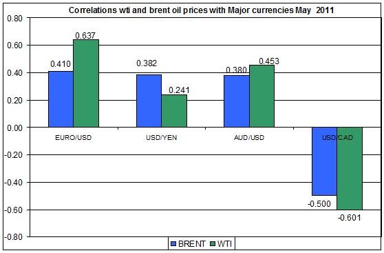 During May there were high correlations among daily percent crude oil prices (WTI and Brent oil) and EUR/USD, AUD/USD and USD/CAD.