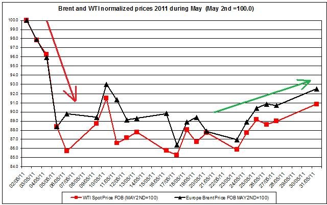 I will present herein the main changes in crude oil prices (WTI and Brent oil) during May, and provide a crude oil prices outlook for June 2011: