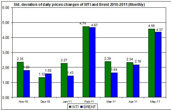 The daily prices had a sharp rise in the standard deviation during May. The standard deviations of the WTI oil and Brent oil daily prices rose to nearly the same values they were back in February, when crude oil prices inclined sharply due to the turmoil in Middle East including Egypt and then Libya.