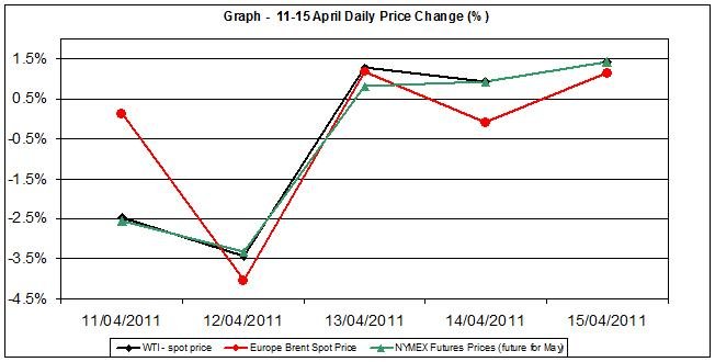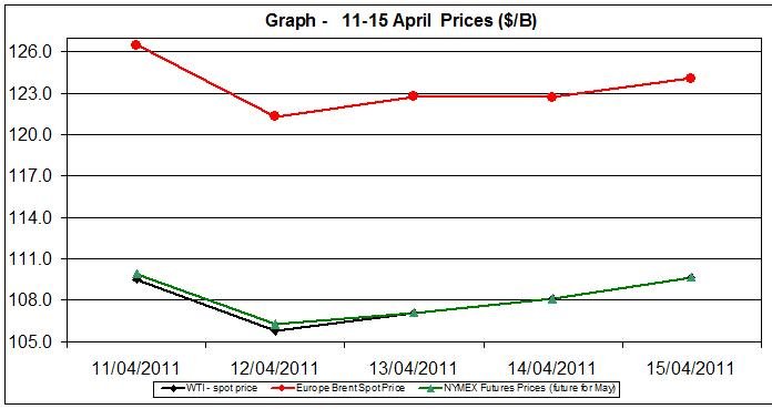 The following chart preset the trend of WTI spot price, NYMEX Futures Prices (May delivery) and Europe Brent spot price during the preceding week: