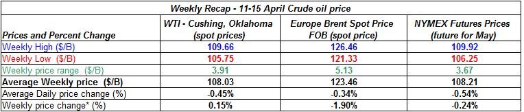 Here is a recap for the week ending on April 15th on crude oil prices (Brent oil and WTI), and a summary of the recent EIA petroleum report: