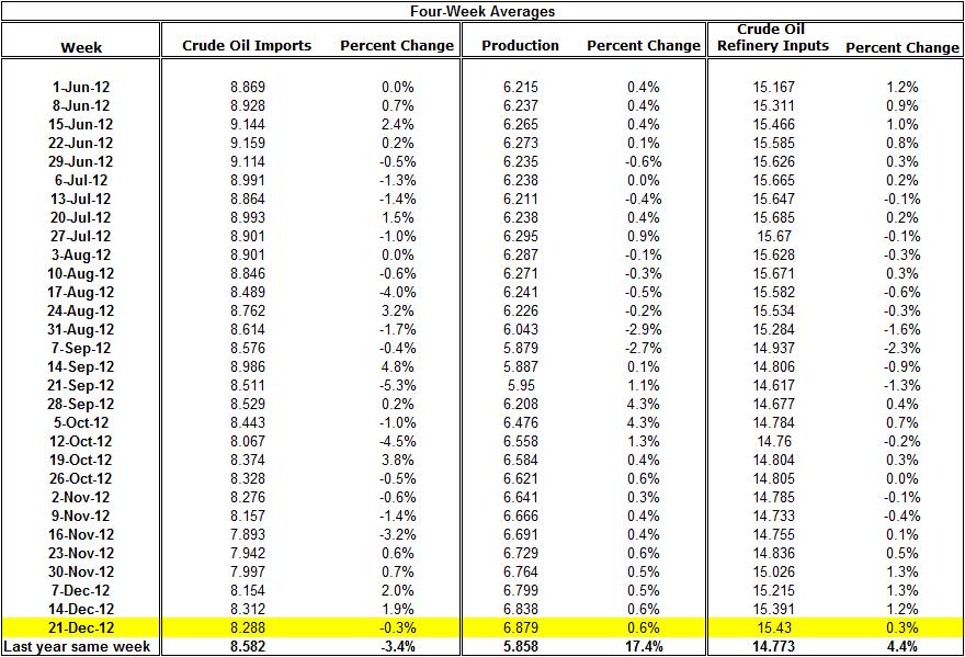 Crude oil imports decreased to 8.288 (for 4 week average) compared with the week of 14/12/2012; they were 3.4% below the average during the same week last year.