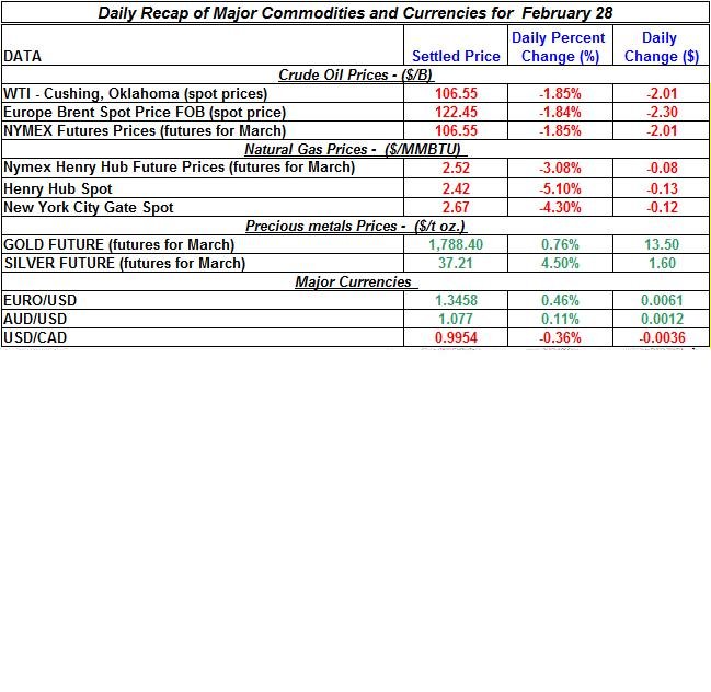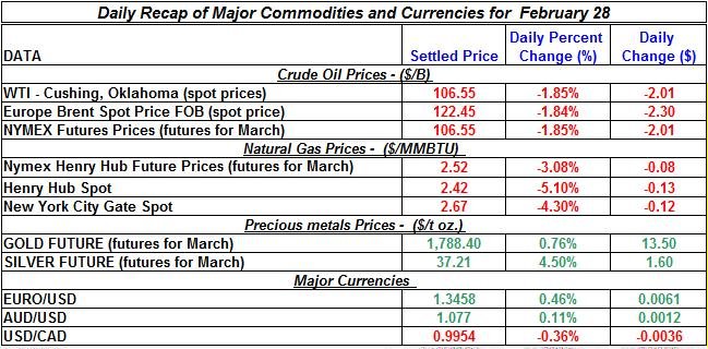 Crude oil continued to trade down for the second consecutive day, while precious metals changed direction and sharply increased during yesterday’s trading: silver added 4.5% to its value while gold only 0.76%. The Euro slightly appreciated again against the US Dollar; the same goes for other major currencies (e.g. Canadian dollar). Here is a summary of the developments of precious metals and energy commodities for February 28th, 2012: