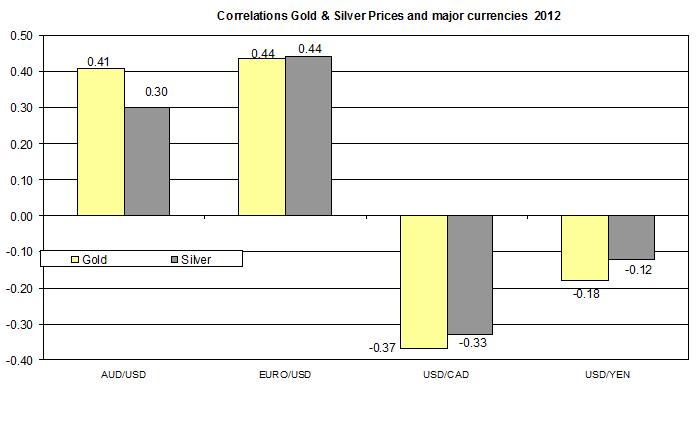 In the chart below are the linear correlations among precious metals and leading currencies pairs during the year. Based on these relations, it seems that if the Euro, Canadian dollar and Aussie dollar will appreciate against the USD than they are likely to help rally bullion rates.