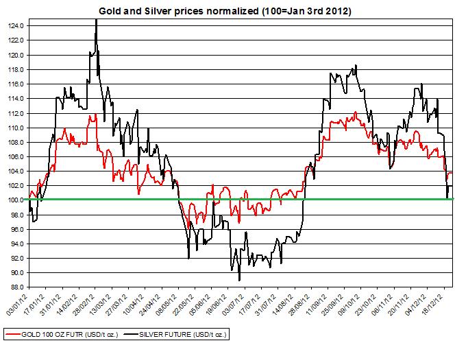 The chart below presents the development of gold and silver prices during 2012, in which gold and silver prices are normalized to 100 for January 3rd, 2012.