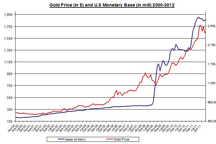 In the chart below are the development of the U.S money base and the price of gold in the past 12 years.