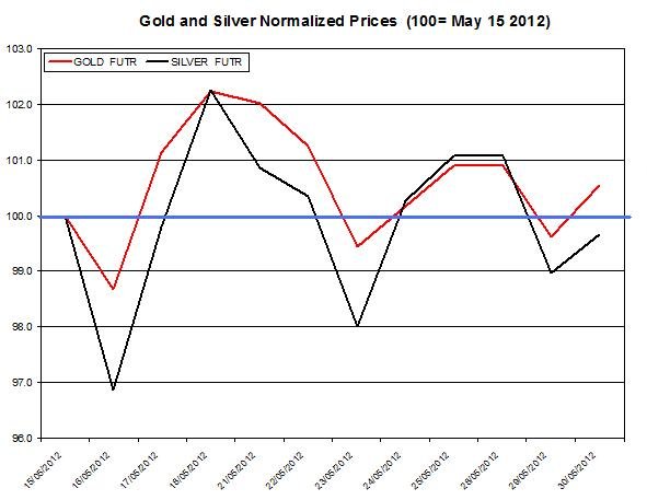 The chart below shows the normalized rates of these metals during the past couple of weeks (normalized to 100 as of May 15th). The chart shows that despite the sharp shifts and turns in bullion rates in the past couple of weeks, gold price is still around the $1,550 mark and silver around $27-$28 mark.