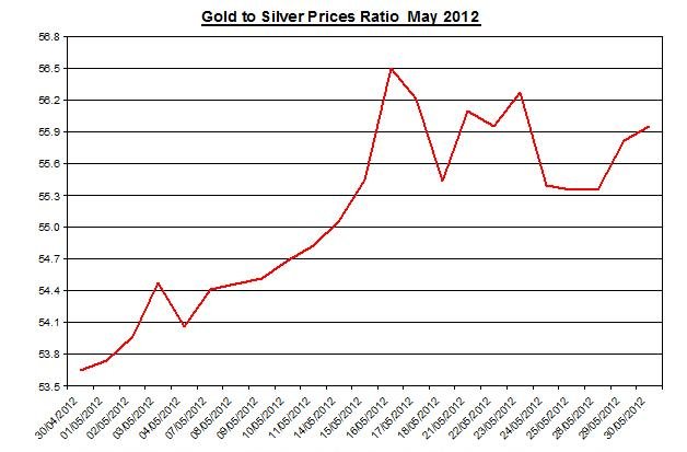 Gold price forecast & silver prices 2012  May 31The ratio between the two metals edged up on Wednesday to 55.95. During the month the ratio increased by 4.28% as silver has moderately under-performed gold during the month.