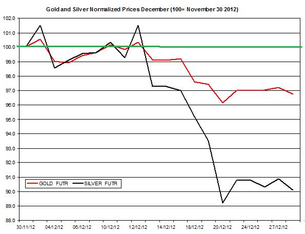 The chart below presents the developments of gold and silver prices during December, in which the prices are normalized to 100 on November 30th 2012.