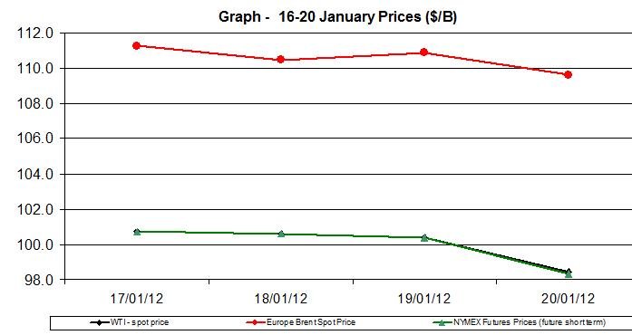 The following charts show the development of (for the week ending on January 20th) WTI spot oil price, NYMEX Futures Prices (Short term delivery) and Europe Brent spot oil price: