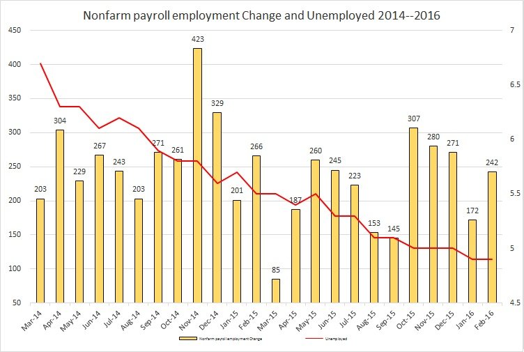The labor isn’t progressing smoothly as indicated by the latest U.S. non-farm payroll: It showed a much higher than expected headline figure: 242K jobs were added in February. The ADP reported a gain of 214K jobs; the market anticipated 195K for February. The growth in wages dropped to 2.2% and wages slipped by 3 cents, month over month rate. The main sectors that expanded were in health care and social assistance, retail trade, food services and drinking places, and private educational services. The rate of unemployment remained flat at 4.9%. The U.S. dollar is slightly falling against other majors; gold and silver are also slightly up. Let’s breakdown this report: