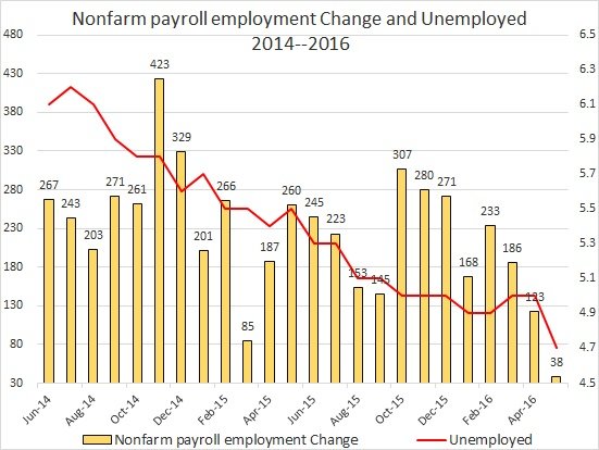 The U.S. non-farm payroll disappointed again with a gain of only 38K jobs in May – the lowest level since September 2010 and way off market estimates: The ADP estimated a gain of 173K jobs and the market expect a rise of 160K. The growth in wages, however, remains steady at 2.5% as wages increased by 5 cents, month over month. The main sector that expanded was in health care while jobs were lost, yet again, in the mining sector. The employment in the information sector contracted due to a strike. The rate of unemployment declined to 4.7%. The U.S. dollar dropped against other majors; gold and silver bounced back. Let’s breakdown this report: